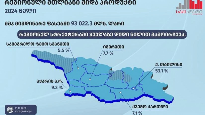 „რეგიონულ სტრუქტურაში ყველაზე დიდი წილით გამოირჩევა: ქ. თბილისი (53.1 პროცენტი), აჭარის ა.რ. (9.3 პროცენტი), იმერეთი (7.7 პროცენტი), ქვემო ქართლი (7.1 პროცენტი) და სამეგრელო-ზემო სვანეთი (5.5 პროცენტი).თბილისში შექმნილი მშპ-ის დარგობრივ სტრუქტურაში ყველაზე დიდი წილით გამოირჩევა საბითუმო და საცალო ვაჭრობა; ავტომობილების და მოტოციკლების რემონტი (23.7 პროცენტი), უძრავ ქონებასთან დაკავშირებული საქმიანობები (10.9 პროცენტი), მშენებლობა (10.4 პროცენტი).აჭარის ა.რ.-ის რეგიონისათვის წამყვან ეკონომიკურ სექტორებს წარმოადგენს მშენებლობა (14.7 პროცენტი), უძრავ ქონებასთან დაკავშირებული საქმიანობები (12.6 პროცენტი), საბითუმო და საცალო ვაჭრობა; ავტომობილების და მოტოციკლების რემონტი (9.5 პროცენტი).იმერეთში, დამატებული ღირებულების მოცულობის მიხედვით ქვეყნის მესამე რეგიონში, დიდი წილი უკავია სოფლის, სატყეო და თევზის მეურნეობას (11.4 პროცენტი), დამამუშავებელ მრეწველობას (10.1 პროცენტი) და განათლებას (9.8 პროცენტი).ქვემო ქართლის მშპ-ში მნიშვნელოვანი წილით არის წარმოდგენილი დამამუშავებელი მრეწველობა (16.1 პროცენტი), სოფლის, სატყეო და თევზის მეურნეობა (14.1 პროცენტი) და სახელმწიფო მმართველობა და თავდაცვა (9.6 პროცენტი)“, - ნათქვამია ინფორმაციაში.