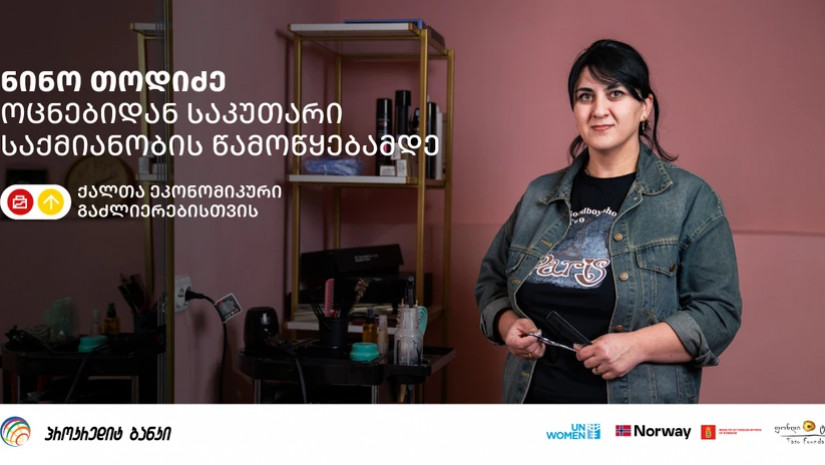 ნინო ქალთა ეკონომიკური გაძლიერების მიზნით განხორციელებული პროექტის მონაწილეა, რომელიც პროკრედიტ ბანკის, გაეროს ქალთა ორგანიზაციის, ნორვეგიისა და დანიის მთავრობების ჩართულობით და “ფონდი ტასოს“ ორგანიზებით განხორციელდა.სესიებში 200 ქალი ჩაერთო, სადაც მათ საკუთარი შესაძლებლობების აღმოჩენა და იდეეების რეალურ საქმიანობად გადაქცევა ისწავლეს. პროექტის 80 მონაწილეს გადაეცა გრანტი, საკუთარი საქმინობის წამოსაწყებად.ნინოს ბოლო რამდენიმე წელია საკუთარი სილამაზის სალონის განვითარება აფიქრებდა - სამუშაო სივრცე უკვე ჰქონდა, მაგრამ საჭირო ინვენტარი აკლდა. სწორედ ამ დროს მეგობრისგან გაიგო პროექტის შესახებ, სადაც მონაწილეებს ჰქონდათ შესაძლებლობა, ტრენინგების გავლის შემდეგ საგრანტო დაფინანსება მიეღოთ.„როგორც კი გავიგე ამ შესაძლებლობის შესახებ, თავიდანვე მჯეროდა, რომ ჩემი მცდელობა შედეგიანი იქნებოდა. პროეტში მონაწილეობა ძალიან სასიამოვნო გამოცდილება იყო - ჩვენი სათემო მუშაკი ყველა ეტაპზე გვერდში მედგა; წყალტუბოში ვიარე ტრენინგებზე. მივიღე ახალი ცოდნა, ინფორმაცია და საბოლოოდ დაფინანსებაც მოვიპოვე,“ - იხსენებს ნინო.პროექტის მხარდაჭერით ნინომ შეძლო სალონისთვის საჭირო ინვენტარის შეძენა. თუმცა, როგორც თავად ამბობს, მიღებული გამოცდილება არანაკლებ ღირებული აღმოჩნდა, ვიდრე მატერიალური მხარდაჭერა.„დავინახე, რომ მარტო არ ვარ - ჩვენ, მონაწილე ქალები ერთ დიდი ძალად ვიქეცით. ბევრი ქალი გავეცანი სხვადასხვა კუთხიდან - ერთმანეთს ჩვენი ისტორიები გავუზიარეთ, დავმეგობრდით და დღემდე გვაქვს ურთიერთობა. შემართება, ძალა და ინსპირაცია გადამდებია, და მიხარია რომ მეც ამ დიდი, ძლიერი ტალღის ნაწილი გავხდი.“ნინო უკვე ხუთი წელია სალონის საქმეს უძღვება. რამდენიმე წლის წინ, სამი შვილის დედა დადგა ამოცანის წინაშე: ფინანსურად დაეჭირა მხარი შვილებისთვის ისე, რომ მათ ფიზიკურად არ დაშორებულიყო. ოქროს შუალედი ნინოს ნიჭის ადგილზე რეალიზაცია - სალონის გახსნა აღმოჩნდა. მიუხედავად იმისა, რომ მან ბავშვობიდან ეხერხებოდა სტილისტის ხელსაქმე, ბიზნესის წამოწყებამდე ნინომ პროფესიული განათლებაც მიიღო და შესაბამისი კურსი გაიარა. სამომავლოდ მას კიდევ აქვს სწავლასა და განვითარებასთან დაკავშირებული გეგმები, რომ სალონი გაზარდოს და თანამედროვე სრტანდარტებს მოარგოს.მისი სიტყვები ბევრი ქალისთვის შეიძლება გზის მაჩვენებელი გახდეს:„მინდა ყველა ქალმა, ვინც ჯერ ვერ იპოვა საკუთარი თავი, იცოდეს - ყველაფერი წინაა. უბრალოდ უნდა გჯეროდეს, რომ ფიქრების, ოცნებების რეალიზაცია 