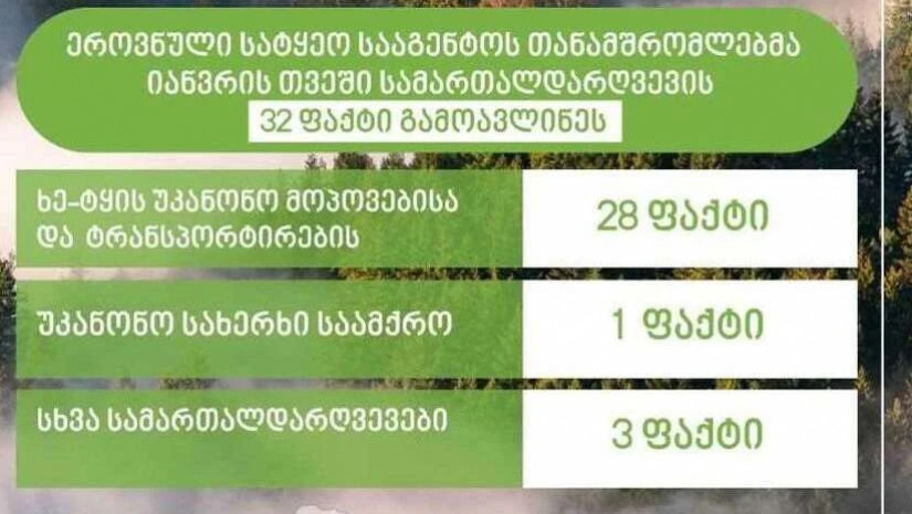 ხე-ტყის უკანონოდ მოპოვების ფაქტებიდან 1 სამართალდარღვევა გამოვლენილია იმერეთის სატყეო სამსახურის თანამშრომლების მიერ, 2 - სამცხე-ჯავახეთის, 1 - რაჭა-ლეჩხუმი-ქვემო სვანეთის, 4 - ქვემო ქართლის, 10 - კახეთის, 1- მცხეთა-მთიანეთის, 2- გურიის, 5 - სამეგრელო-ზემო სვანეთის, ხოლო 2 - შიდა ქართლის სატყეო სამსახურის თანამშრომლების მიერ.ასევე, გამოვლინდა სახელმწიფო ტყის თვითნებურად დაკავების 3 ფაქტი და 1 დაურეგისტრირებელი სახერხი საამქრო კახეთის რეგიონში.სამართალდარღვევებიდან სისხლის სამართლის დანაშაულის ნიშნებს შეიცავს 3 ფაქტი, მასალები გადაგზავნილია შესაბამის საგამოძიებო უწყებაში.