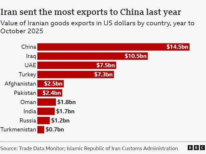 2025 წლის ოქტომბრამდე მან ირანიდან 14 მილიარდ დოლარზე მეტი პროდუქტი შეიძინა, Trade Data Monitor-ის მონაცემებით, რომლებიც ირანის ისლამური რესპუბლიკის საბაჟო ადმინისტრაციის სტატისტიკას ეფუძნება.