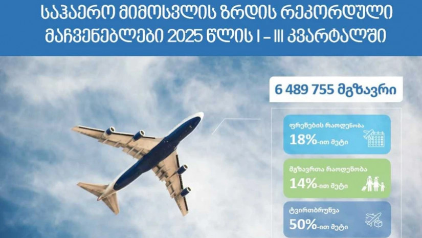 „იანვარ-სექტემბერში საქართველოს აეროპორტები 6 489 755 მგზავრს მოემსახურნენ, რაც 2024 წლის ანალოგიურ პერიოდში არსებული მგზავრთნაკადის (5 682 304) რაოდენობას 14%-ით აღემატება. ცალკეულად, თბილისის საერთაშორისო აეროპორტი მოემსახურა 4 067 202 მგზავრს, რითაც ზრდამ 2024 წლის ანალოგიურ პერიოდთან მიმართებაში 12%-ი შეადგინა. ქუთაისის საერთაშორისო აეროპორტმა მიიღო 1 407 814 მგზავრი, რაც 10%-ით აღემატება გასული წლის ანალოგიურ პერიოდში გადაყვანილი მგზავრების რაოდენობას. ყველაზე მაღალი ზრდა კი ბათუმის საერთაშორისო აეროპორტში დაფიქსირდა. კერძოდ, 9 თვეში აეროპორტი მოემსახურა 995 099 მგზავრს, რაც 32%-ით მეტია შარშან გადაყვანილი მგზავრების რაოდენობაზე.