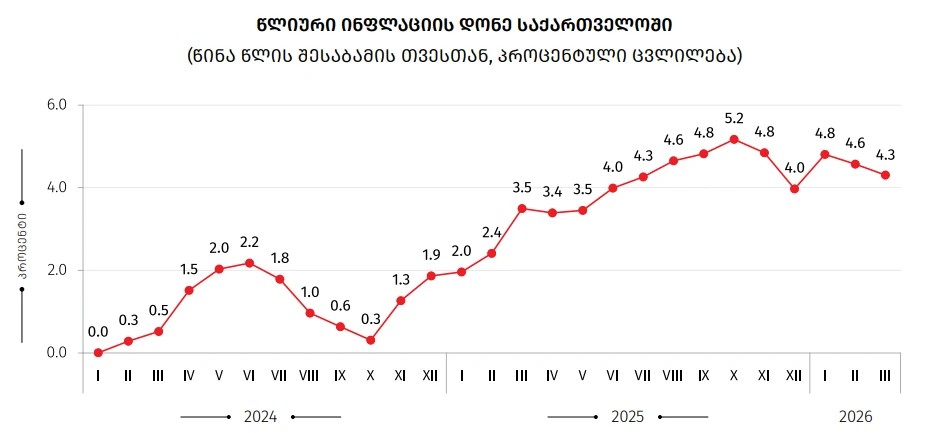 საქსტატმა 2026 წლის მარტის წლიური ინფლაციის ანგარიში გამოაქვეყნა, რომლის თანახმადაც გასულ თვეში წლიურმა ინფლაციამ 4.3% შეადგინა. შედარებისთვის, თებერვალში წლიური ინფლაცია 4.6%-ს შეადგენდა, შესაბამისად, ის 0.3 პროცენტული პუნქტით არის შემცირებული. წლიური ინფლაციის ტემპის შემცირებაზე გავლენა მოახდინა სურსათის სექტორმა, სადაც ფასები წლიურ ჭრილში 7.5%-ით არის გაზრდილი, შედარებისთვის წინა თვეებში სურსათის გაძვირება წლიურ ჭრილში 9-10%-საც შეადგენდა, შესაბამისად სურსათის გაძვირების ზრდის ტემპის შენელებამ წლიური ინფლაციის მაჩვენებლის კლება განაპირობა.