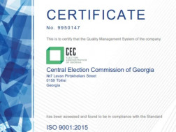 ISO-ს სტანდარტი წარმოადგენს ხარისხის მართვის ერთ-ერთ ყველაზე აღიარებულ საერთაშორისო ჩარჩოს, რომლის მიზანია ორგანიზაციის საქმიანობის ეფექტიანობის, გამჭვირვალობისა და მომხმარებელზე ორიენტირებულობის უზრუნველყოფა.ISO-ს სტანდარტის მოთხოვნებთან შესაბამისობის დადგენის მიზნით, შპს ,,მენეჯმენტის სისტემების’’ აუდიტორის მიერ 2025 წლის 3 ივლისს განხორციელდა შიდა აუდიტი, ხოლო 2025 წლის 19 აგვისტოს დისტანციურად განხორციელდა სასერტიფიკაციო აუდიტი საერთაშორისო აუდიტორების მიერ. ორივე სახის აუდიტი წარმატებით დასრულდა და ცესკომ მოიპოვა მორიგი საერთაშორისო ISO 9001:2015 სერტიფიკატი.საქართველოს საარჩევნო ადმინისტრაციის ხარისხის მართვის სისტემის (QMS) მრავალ დადებით მხარესა და უპირატესობას შორის, აუდიტორის მიერ აღნიშნულ იქნა შემდეგი ასპექტები: კარგად ჩამოყალიბებული სტრატეგია კონკრეტული შედეგების მისაღწევად; საარჩევნო პროცესისა და ხმის მიცემის პროცედურების მაღალ დონეზე მართვა/რეგულირება; არჩევნებში ჩართულ მხარეებთან მუდმივი კომუნიკაცია; საოლქო და საუბნო საარჩევნო კომისიების წევრების ფართომასშტაბიანი სწავლება და გადამზადება; ინფორმირების კამპანიის ფარგლებში საარჩევნო ელექტრონული ტექნოლოგიების ფართომაშტაბიანი გამოყენება. აუდიტის შედეგად კიდევ ერთხელ დადასტურდა, რომ ადმინისტრაციის მიზნები, ამოცანები, აქტივობები და პროექტები, შეთავაზებული სერვისები და საქმიანობის მონიტორინგი შეესაბამება ხარისხის მენეჯმენტის მიერ მოთხოვნილ ყველა სტანდარტს.როგორც საერთაშორისო აუდიტორის შეფასებაშია აღნიშნული „ადმინისტრაციის საქმიანობა პასუხობს საერთაშორისო სტანდარტის მოთხოვნებს. დადასტურდა, რომ ორგანიზაციის მენეჯმენტის სისტემა (MS) წარმატებით უზრუნველყოფს დადგენილი სტანდარტის (სტანდარტების) შესაბამისი მოთხოვნების შესრულებას და აკრედიტებული სერტიფიცირებისთვის მოსალოდნელი შედეგების მიღწევას, როგორც ეს განსაზღვრულია ISO IAF-ის კომუნიკეში აკრედიტებული სერტიფიცირების შესახებ. ორგანიზაცია აკმაყოფილებს და შესაბამისად ახორციელებს MS-ის შესაბამის მოთხოვნებს და შეუძლია უზრუნველყოს ამ სერვისის უწყვეტი მიწოდება მომხმარებლის მოთხოვნებისა და შესაბამისი კანონებისა და რეგულაციების შესაბამისად, მომხმარებლის კმაყოფილების გაზრდის მიზნით.“აღსანიშნავია, რომ ცესკოსთვის ხარისხის მართვის საერთაშორისო სტანდარტის შენარჩუნება ნიშნავს არამხოლოდ ეფექტიანი შიდა მენეჯმენტის დემონსტრირებას, არამედ საზოგადოების წინაშე ანგარიშვალდებულებისა და გამ